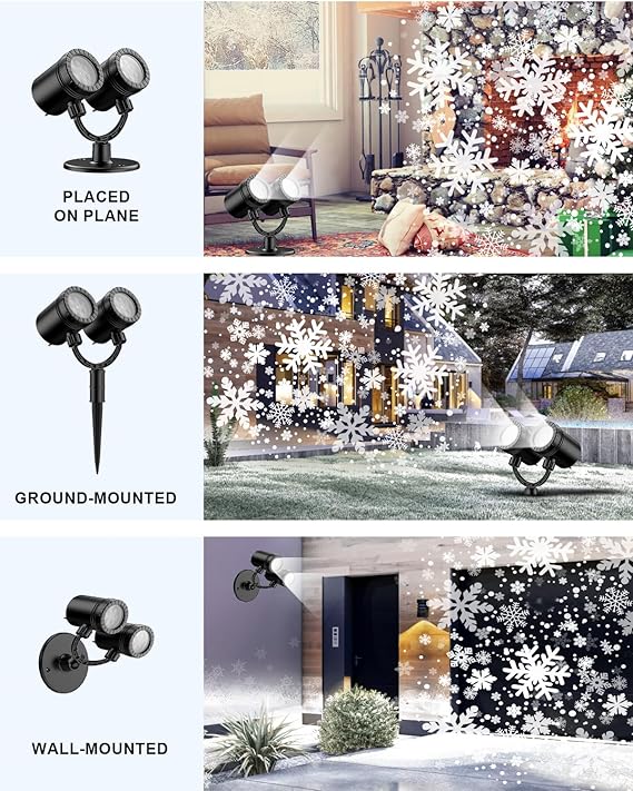 Designed with simplicity in mind, installing the projector light is a breeze. With just a few simple steps, you can position it perfectly and immerse yourself in the dazzling snow scene at any time. 3 installation methods include base mount, wall mount, and ground mount.