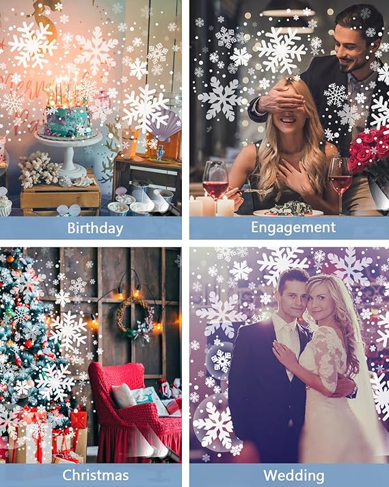 Equipped with an IP65 waterproof projector and an IP44 power cord, you can enjoy precious moments with your family and friends in all extreme weather indoors and outdoors. The angle can be adjusted within 180°, projecting romantic snowflakes anywhere you want. Adjust the projection angle and brightness according to your preference, easily creating the perfect visual effect.