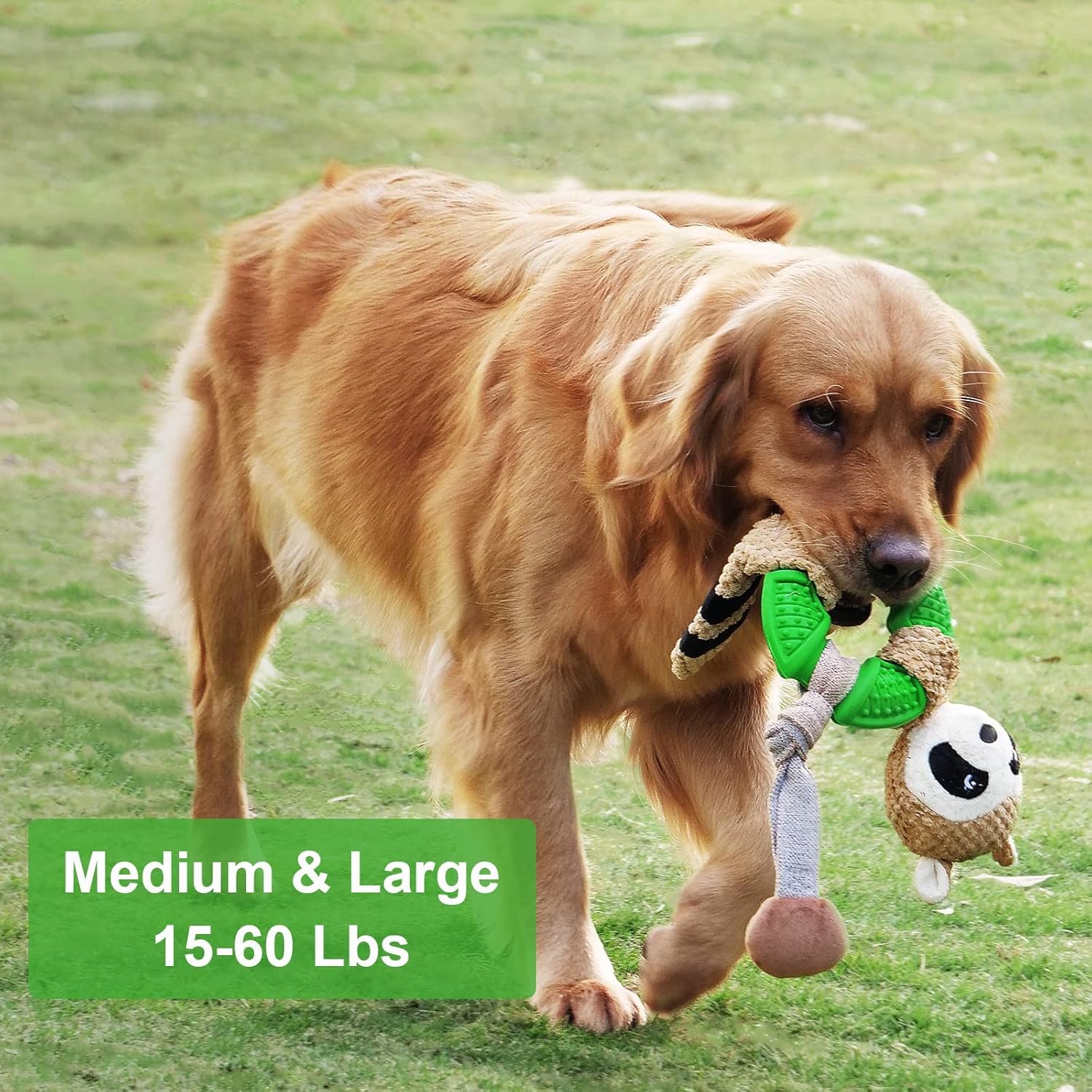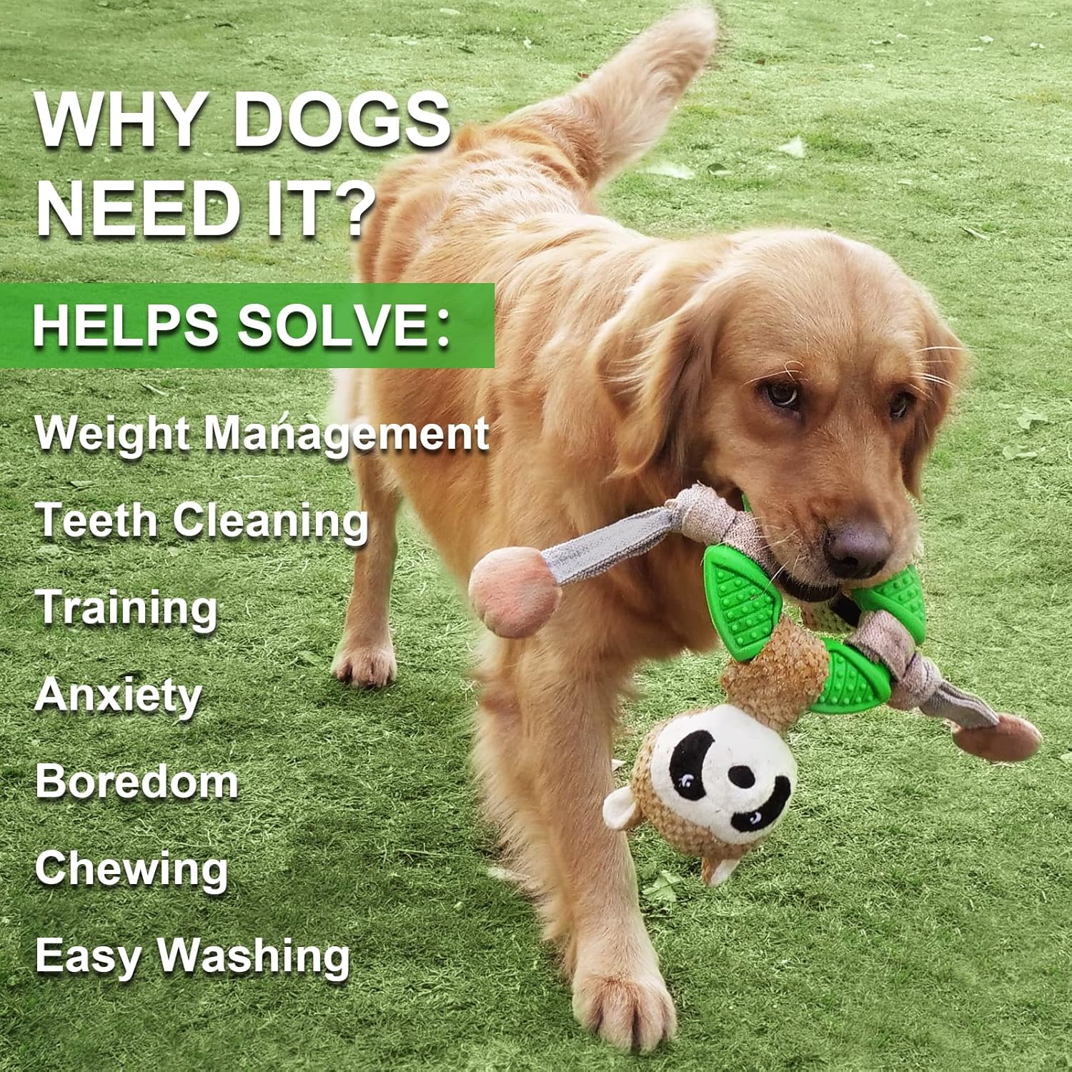 This puppy teething chew toy is composed of natural rubber, durable rope and squeaky plush. By applying peanut butter, it can attract dogs to chew and clean their teeth. The tough dog rope toy allows dogs to play tug-of-war interactive games. The velvet may be bitten off, but it will not affect normal use.