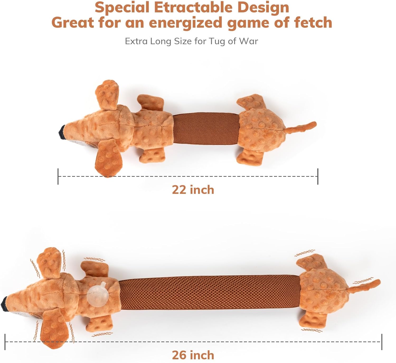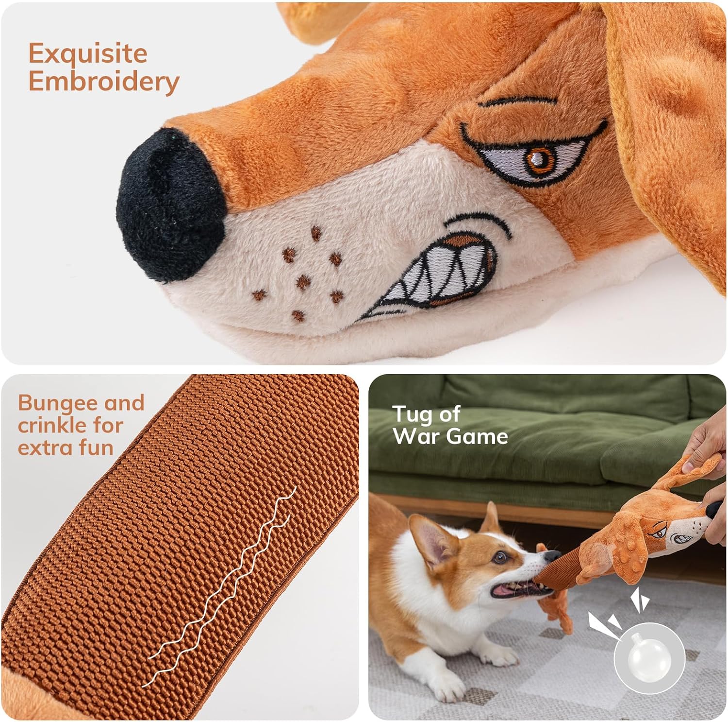 Discover the magic of the flexible retractable spring hidden in the belly that lets your dog pull and stretch to his heart's content. This engaging feature sparks their curiosity and keeps them entertained for hours. Plus, the durable pull cord adds a delightful interactive element, promoting a game of tug-of-war that strengthens the bond between you and your furry baby. (Not for aggressive chewers)