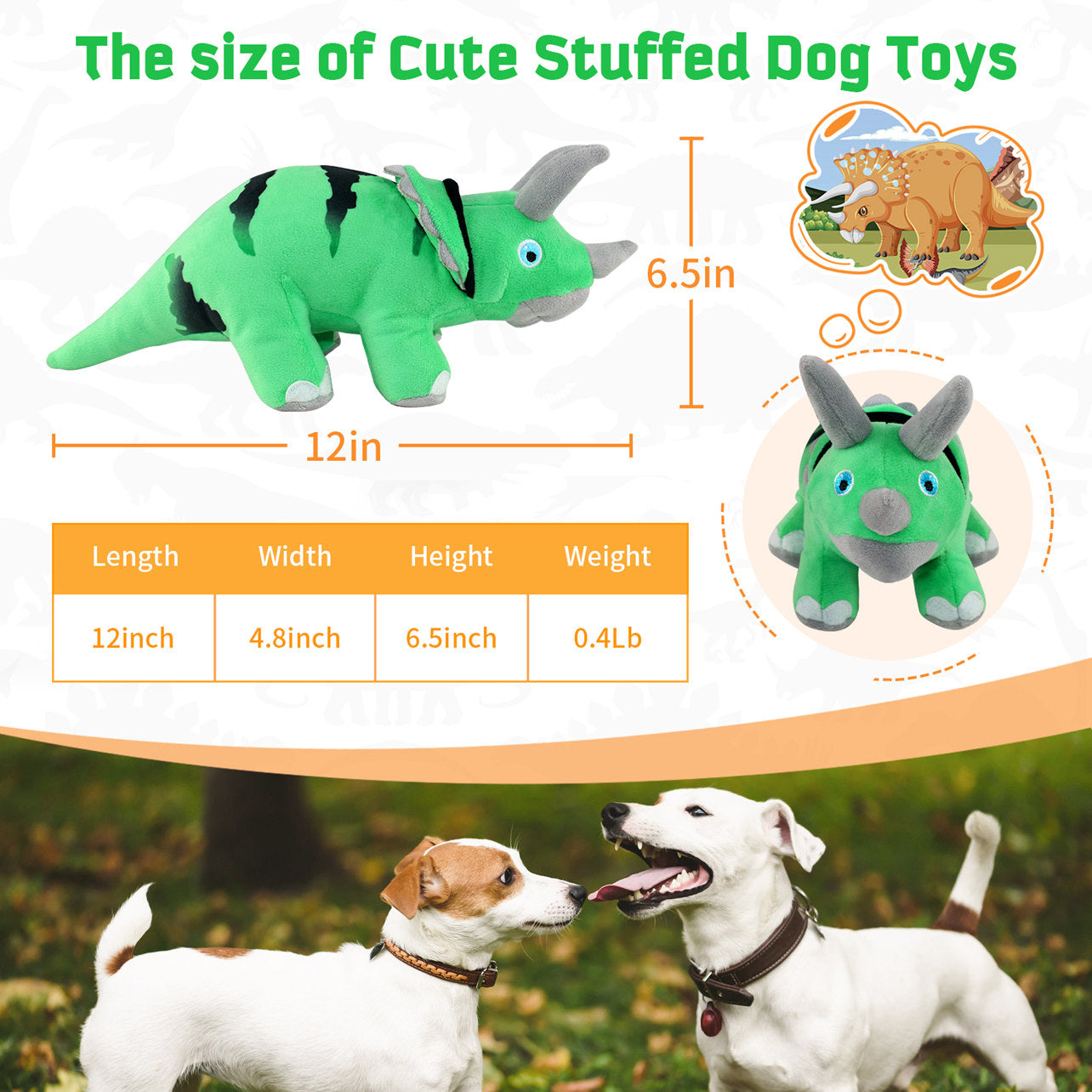 This plush dog toy is about 12 inches, unique cartoon Triceratops design, and is made of super soft fabric, comfortable to touch. Realistic details include embroidery around the eyes and delicate triangles for a visual treat for dogs.