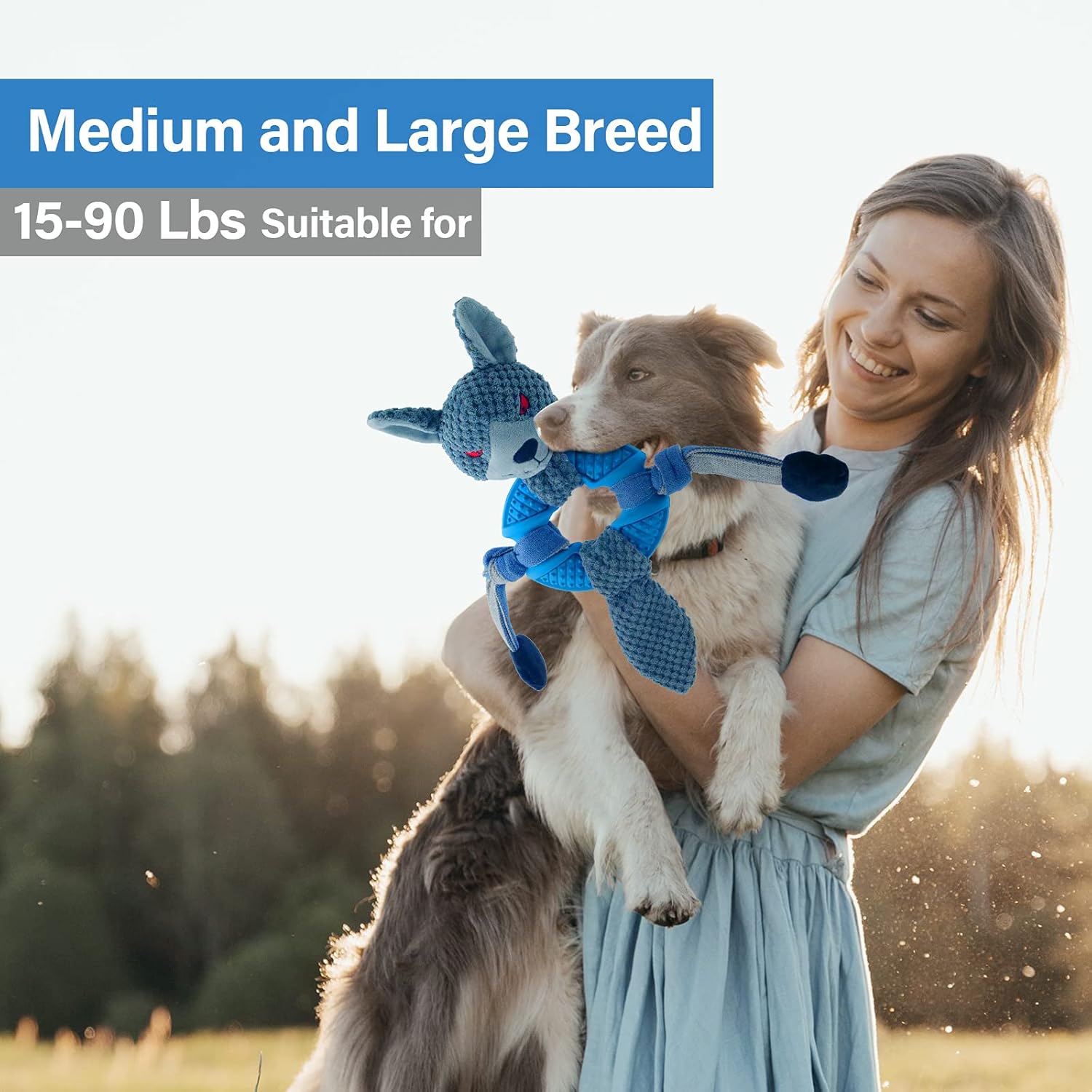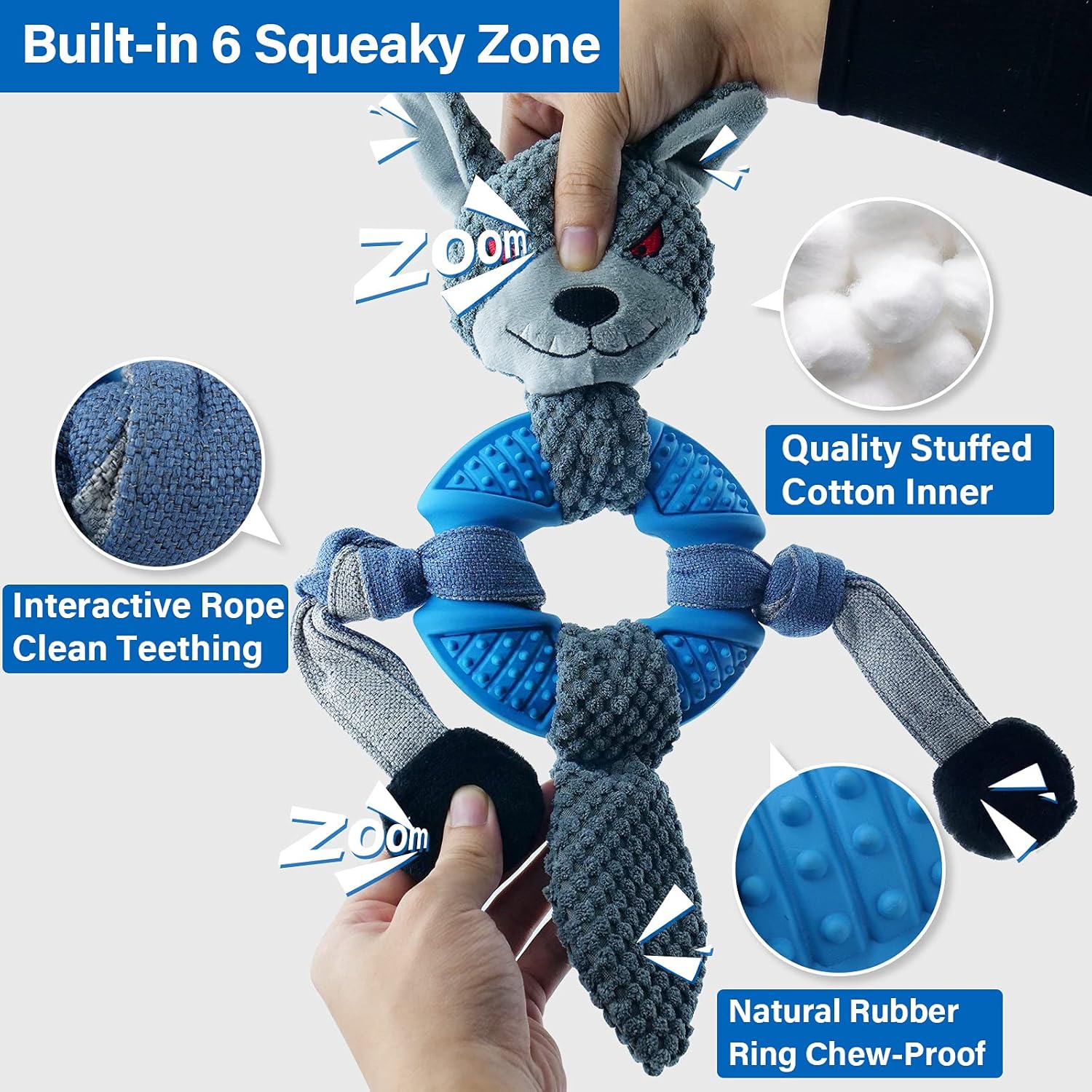 This cute plush dog toy is made of natural rubber, anti-chew rope, and squeaky plush. By applying peanut butter, it can attract dogs to chew and clean their teeth. The sturdy and unbreakable dog rope toy allows dogs to play interactive tug-of-war games. The velvet may be bitten, but it does not affect normal use.