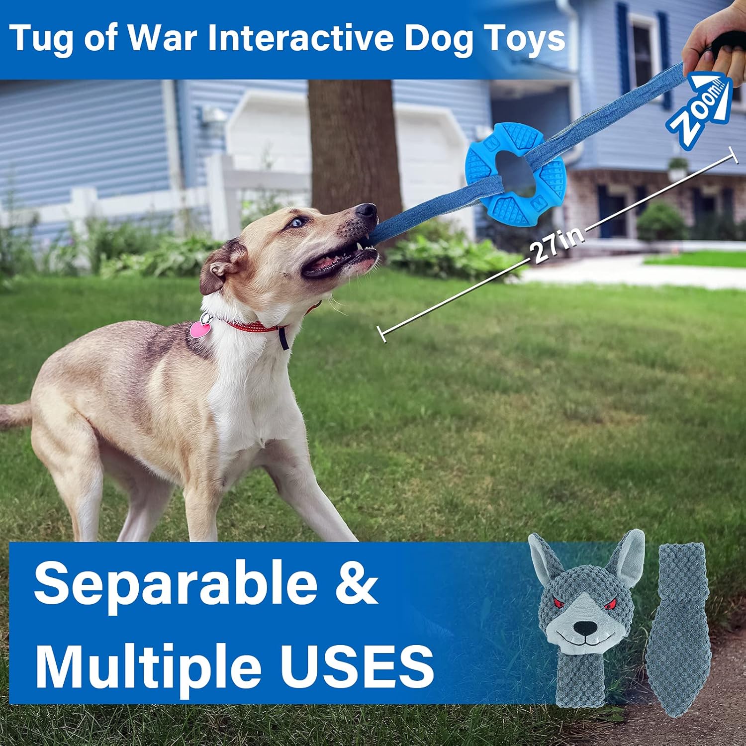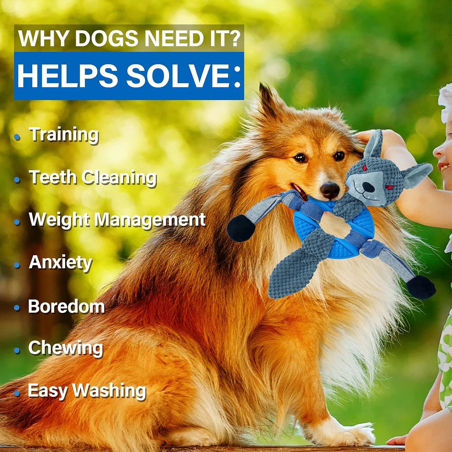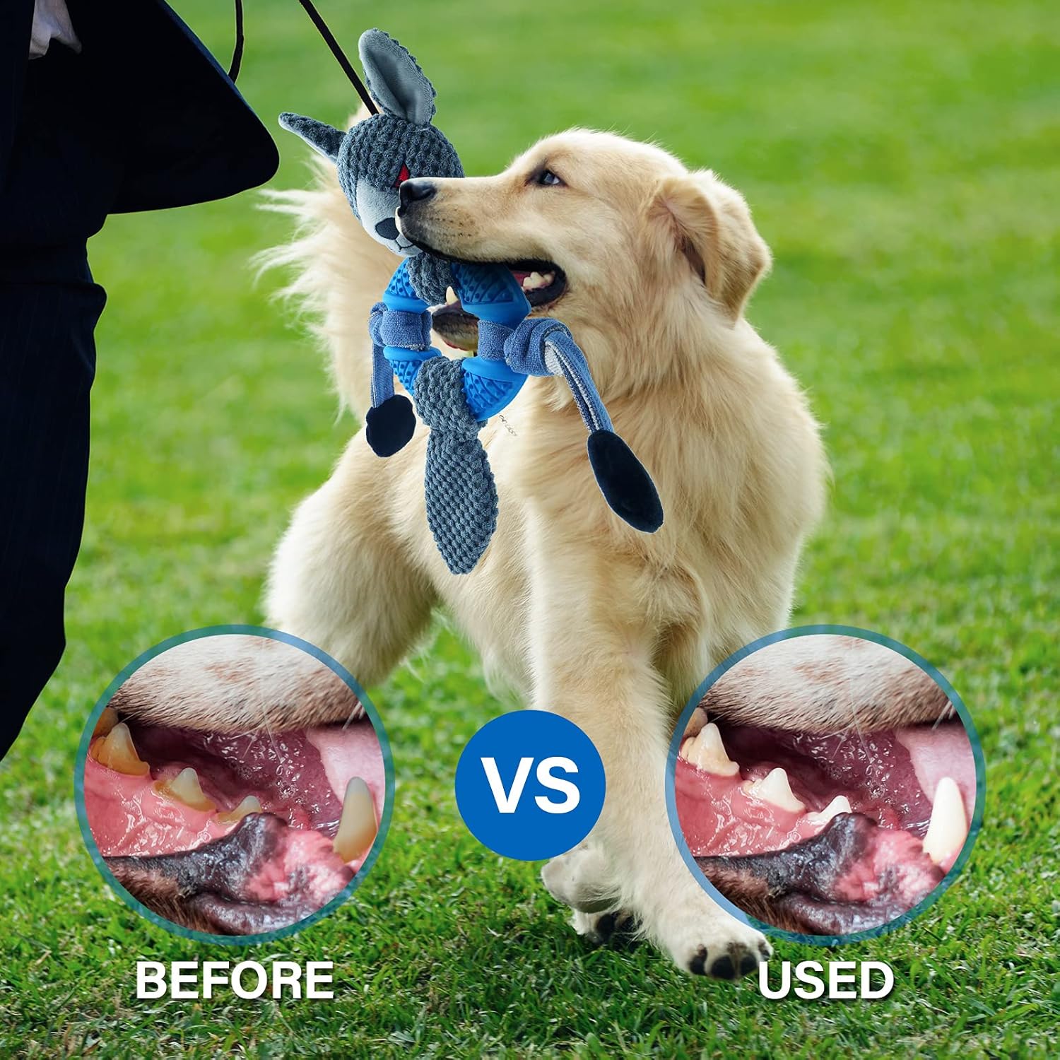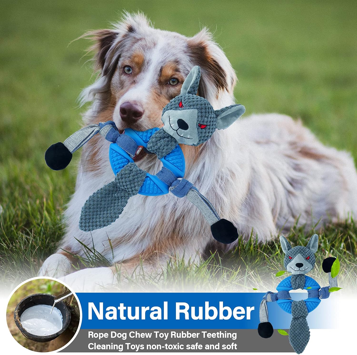 This squeaky dog toy is composed of natural rubber, anti-bite rope, and squeaky plush. By applying peanut butter to the rubber ring, it can attract dogs to chew and clean their teeth. The sturdy and unbreakable dog rope toy allows dogs to play interactive tug-of-war games. The velvet may be bitten, but it does not affect normal use.